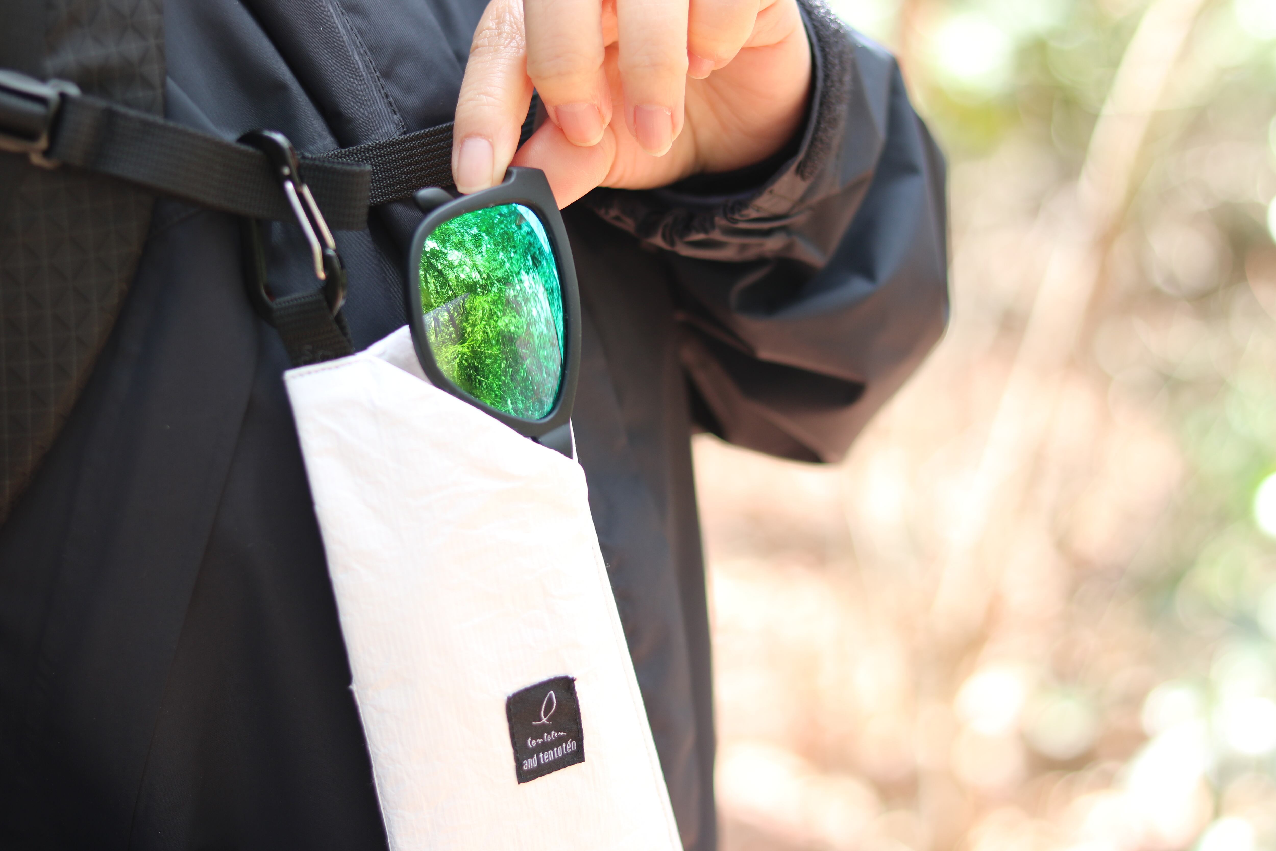 ハイク中、逆さにしないかぎりはサングラスが外に飛び出してしまう可能性は低いと考えられますが、飛び出し防止用に角(右上)の部分を内側に折り込める設計になっています。